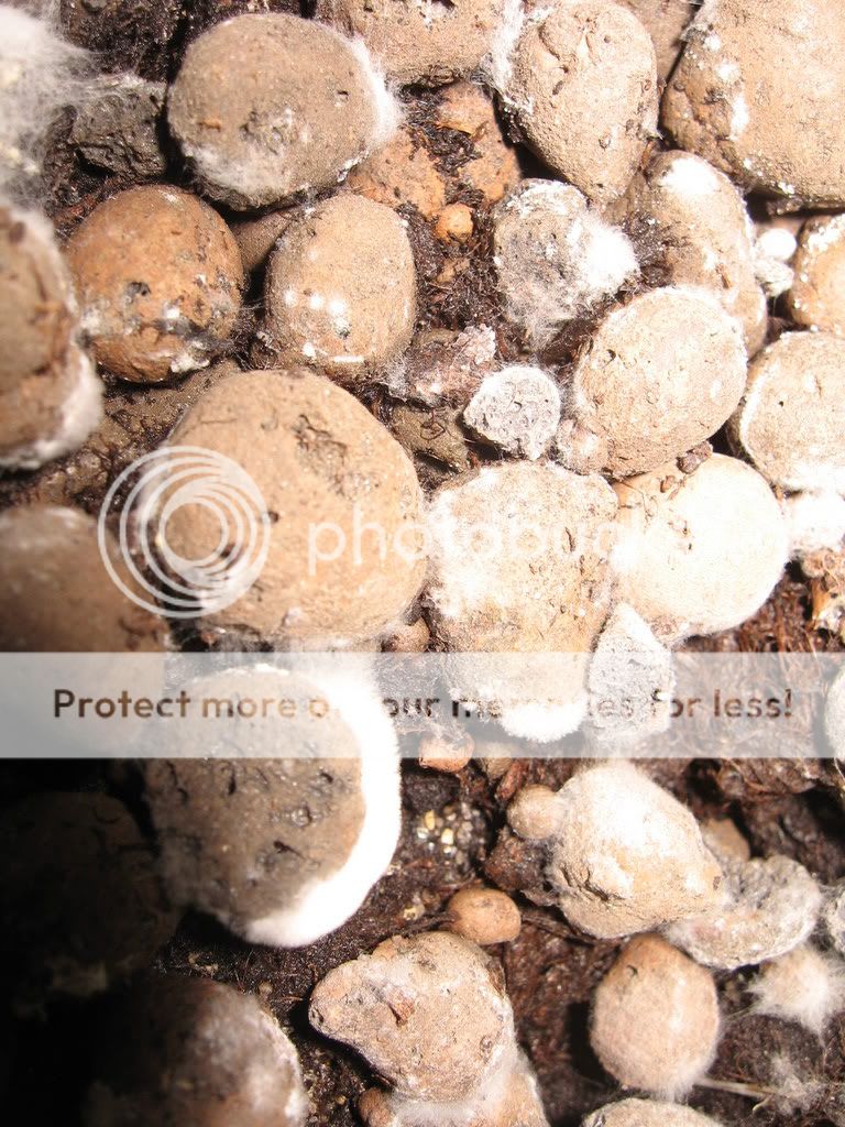 Såg något riktigt tråkigt igår. Något litet vitt har börjat visa sig här och där på topplagret. Verkar som om det har börjat växa mögel på jorden – tror inte att det är rotlöss. Jag har ju besprutat flickorna med vatten och lite näring, så topplagret har varit rätt så fuktigt hela tiden. Jag kommer inte att spruta lika mycket på dem nu, och så kommer jag att låta det vädra ur lite så att luftfuktigheten sjunker. Samt antingen byta ut eller vända på topplagret. Förhoppningsvis försvinner det snart.
